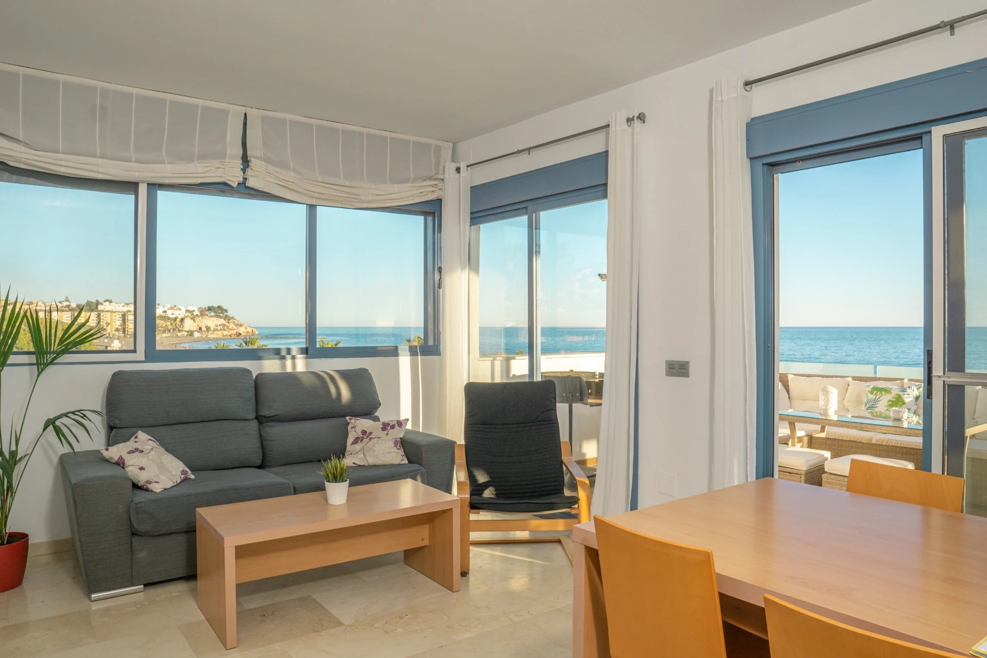 Ein großes Wohnzimmer mit gemütlicher Sitzecke und Panoramablick auf das Meer. Der direkte Zugang zur Terrasse ermöglicht den Gästen einfachen Zugang zum Außenbereich.